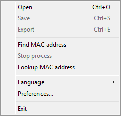 The File menu includes various commands for controlling the software, saving or opening results, scanning the network for MAC addresses.