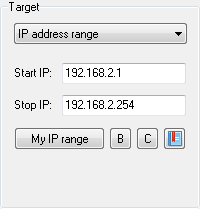 When you click the B or C button in the Panel Target group, the range of addresses for a network of the B or C class respectively will be generated according to the values specified in the Start IP field.