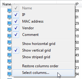 The following menu will appear if you click the title of a column in the list of scan results.
