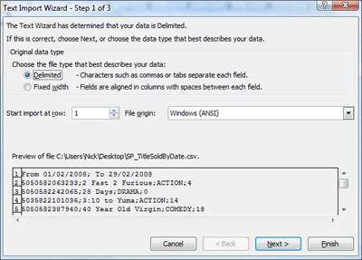 Select ‘delimited’ if your data is seperated with a specific character. You’ll have to specify the delimiting character on the next step. If you have a header row, enter a value for ‘Start Import at row…’