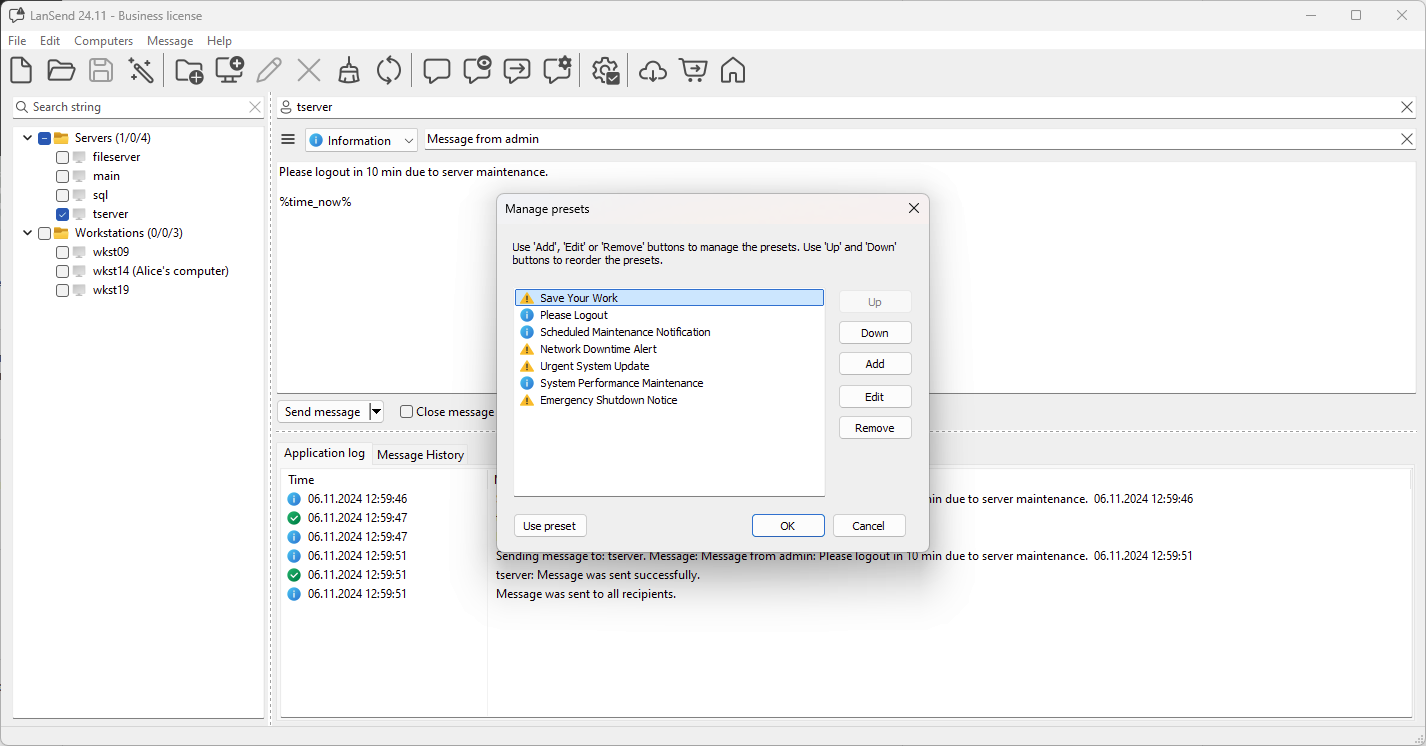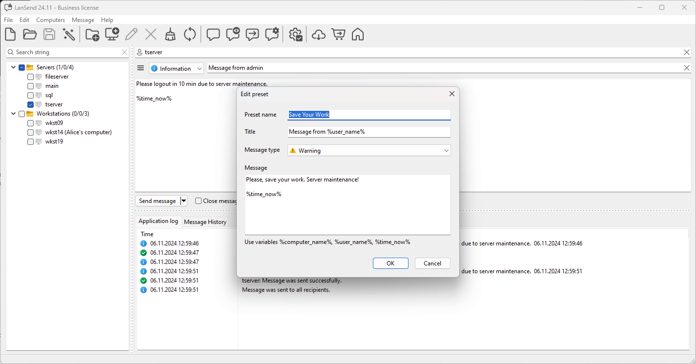 Creating a New Preset: Click Add to open the preset editor. Fill in details such as Preset Name, Title, Message Type, and the Message content. You can add variables like %user_name% or %time_now% for dynamic information. Click OK to save.