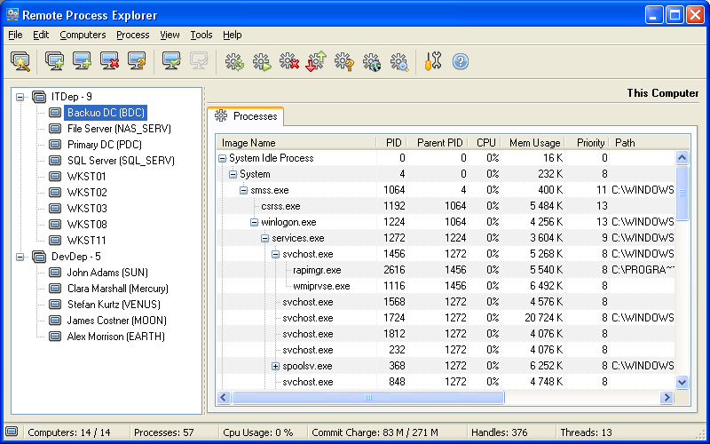 Remote Process Explorer allows system administrators to manage remote processes and control remote computers. The product replaces Windows Task Manager with a more sophisticated version. Remote Process Explorer allows network administrators to monitor all local and remote processes through a single user interface, accessing vital information about processes such as Process ID, Parent PID, Priority, Handles, Threads, and much more, in real-time. The product displays complete information about every local and remote process, including owner information, CPU time and memory consumption, path to executable file, and much more. Remote Process Explorer is free for personal use.