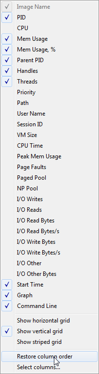 To sort processes by any column, click the column header. To show the process list in the form of a tree, click the “Image Name” column.
