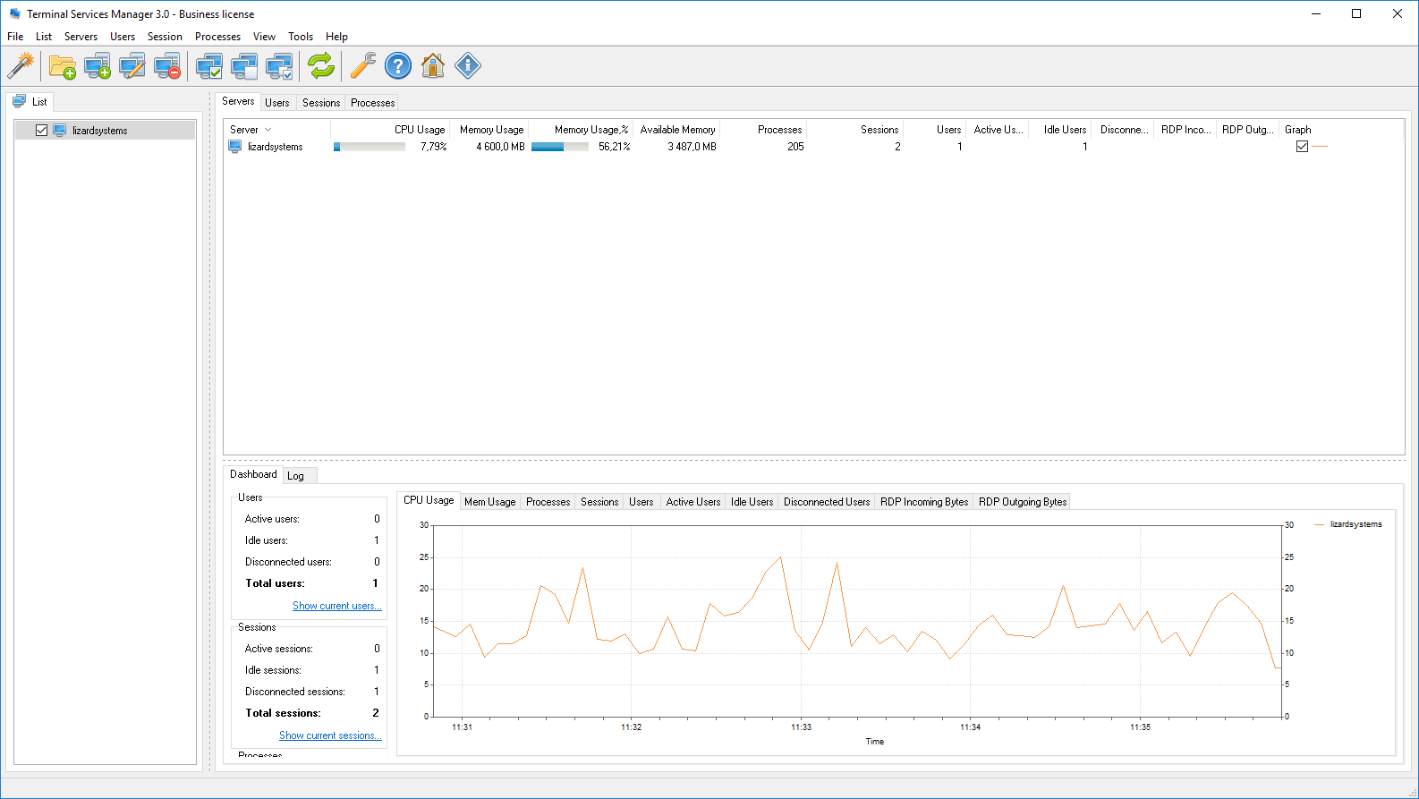 Using Terminal Services Manager, you can see the details of users connected to a remote host, their sessions, and their active processes. For several hosts simultaneously, you can monitor each user, session, and process's usage of remote host resources (CPU, memory, etc.) in real-time. Using Terminal Services Manager, you can easily perform various administrative tasks to manage resources and users on a remote host, for example, disconnecting all inactive users, closing inactive users' sessions, or terminating a remote host process.