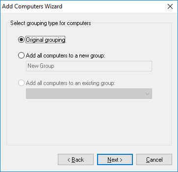 If you select the Leave original grouping option, you will add the computers the way they were shown on the previous page and computer groups will correspond to the domains and workgroups detected in the network neighborhood.