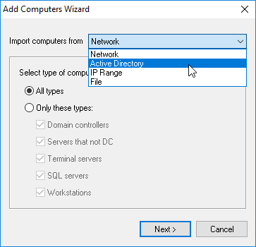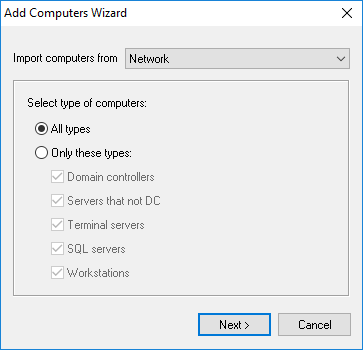 You can select the types of computers that will be added to the computer list on this page. For example: to add only workstations to the list, leave only the Workstation checkbox selected or you can select the Servers that not DC checkbox if you need only servers.