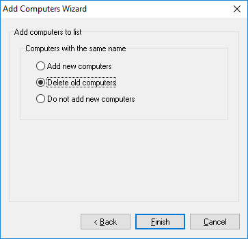 Found computers will be added. If the computer is in the list then the old one will be deleted and the new computer will be added.