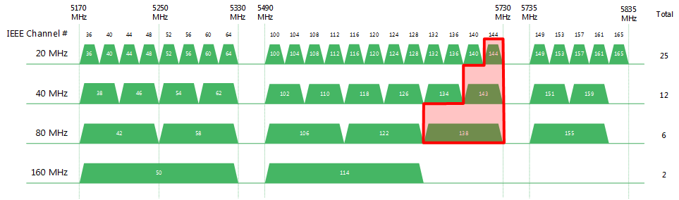 Furthermore, even on 802.11ac access points, many AP vendors still have firmware that complies with the older FCC specifications - pre-March 2014 and do not recognize Channel 144 as valid for use. Accordingly, Channel 144 (20 MHz), Channel 143 (40 MHz), and Channel 138 (80 MHz) often cannot be used.