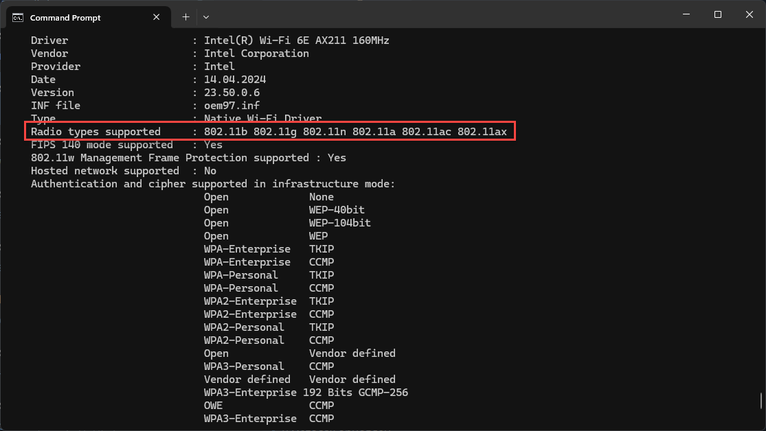 Wi-Fi 6 (802.11ax) support is partially implemented in Windows 10, but some versions of the operating system may incorrectly display the standard. Full support for Wi-Fi 7 (802.11be) is only available in Windows 11, starting from version 24H2. For more information, refer to Microsoft's official documentation: Modern Wi-Fi Standards Support.