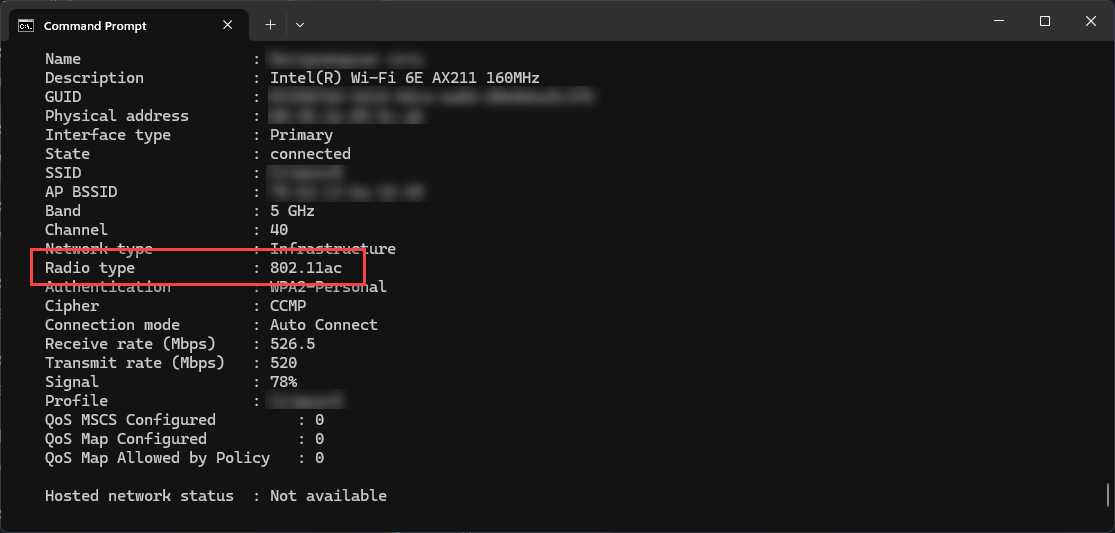 Look for the "Radio type" line—it shows the actual Wi-Fi standard.